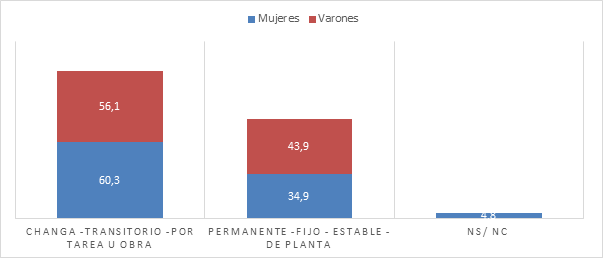 Otro indicador relevante que nos permite caracterizar las condiciones laborales de las mujeres del barrio San Ignacio y La Morita tiene que ver con la estabilidad laboral. En el Gráfico 3 podemos observar que el 60,3% de las mujeres tiene trabajos transitorios, changas o por tarea frente al 34,9% que lo hace de manera estable o fija. En el caso de los varones quienes tienen empleos considerados inestables representan el 56,1% y aquellos que se ocupan de manera estable el 43,9%. Como podemos observar la inestabilidad es un rasgo transversal a los trabajadores y trabajadoras pero que, sin embargo, se manifiesta en mayor medida en el caso de las mujeres.