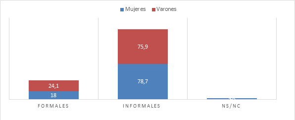 También es importante la proporción de mujeres que realizan su trabajo dentro del hogar alcanzando un 12,7% mientras que los varones solo representan el 3,3%. Esto podría suponer la posibilidad de compatibilizar el trabajo remunerado que realizan las mujeres para la obtención de ingresos con las responsabilidades domésticas y de cuidado. Sin embargo, la simultaneidad de tareas productivas y reproductivas que realizan las mujeres diariamente en sus hogares es señalado en las entrevistas como uno de los mayores factores de agotamiento físico y mental que padecen.