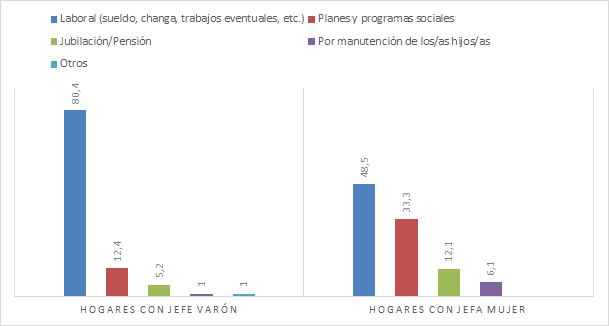 Si se analizan los hogares en función de las jefaturas de varones y mujeres se encontró que el 53,9% de las trabajadoras son jefas de hogar, mientras que en el caso de los varones este porcentaje asciende al 80,4%. Los datos analizados muestran que, si bien en los núcleos familiares comandados por mujeres tienen como fuente principal de ingresos la laboral alcanzando un 48,5%, en segundo lugar, encontramos nuevamente una importante presencia de las políticas sociales que llegan a representar el 33,3%. En cuanto a los hogares con varones jefes el 80,4% de los ingresos proviene del trabajo y en segundo lugar de las políticas sociales, pero ya desciende considerablemente esta proporción a un 12,4%. Dentro del grupo de mujeres que reciben algún tipo de asistencia o programa social, el 36,4% percibe la Asignación Universal por Hijo (AUH) y el 16,7% el programa Tarjeta Más Vida para la compra de alimentos. Las políticas que requieren algún tipo de contraprestación laboral se concentran en el Programa Argentina trabaja a través de las cooperativas de trabajo. Sin embargo, el porcentaje de participación y de presencia de esta modalidad es considerablemente bajo en los barrios estudiados.
