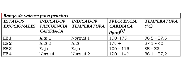 Con el análisis de los datos mencionados junto con otras investigaciones médicas, tomadas como base, se realizó la Tabla 1 comparativa de rangos fisiológicos establecidos de los cuatro estados subjetivos que se utilizaron para la programación del aplicativo en las pruebas de campo.