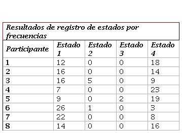 En la Tabla 2, considerando que el tiempo de la recolección de datos fue de 30 minutos, se puede observar el registro de los estados por frecuencias (frecuencia = variación por minuto) de las pruebas de campo realizadas a los 8 árbitros de fútbol participantes, identificando que la mayor distribución de los resultados se encuentra en los estados 1 y 4, solo en 3 participantes presentan más de dos estados y en ningún participante se identifica presencia de los 4 estados.