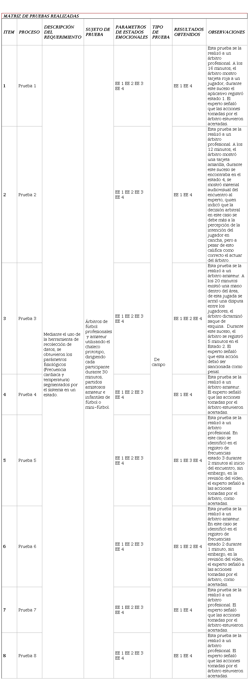 El análisis de las pruebas de campo se realizaron con el criterio y seguimiento de un experto en el área (ex árbitro profesional), a quien se le mostró el material audiovisual de las pruebas realizadas para el vídeo análisis. El experto observó que los árbitros no tomaron decisiones que se encontraran fuera del reglamento deportivo, relacionando el criterio del experto sobre las acciones de los árbitros en este periodo, con los datos registrados por el prototipo. Con ello, se logró determinar que durante estas pruebas la labor profesional de dichos árbitros no fue influenciada a pesar de la presencia de los diferentes estados emocionales, así como su correcto desempeño arbitral. Durante el desarrollo de estos encuentros deportivos, los sujetos puestos a prueba lograron el manejo y control de sus emociones, realizando su labor con objetividad y profesionalismo.