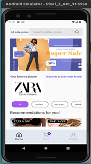 El objetivo de la pantalla principal de la aplicación móvil es mostrar al usuario información que capte su atención. Se muestran los negocios que ha marcado como favoritos de los cuales va a recibir notificaciones cuando tengan ofertas o creen nuevos productos, también se muestran recomendaciones de productos y una barra de búsqueda que le permite encontrar cualquier producto acorde a sus necesidades.
