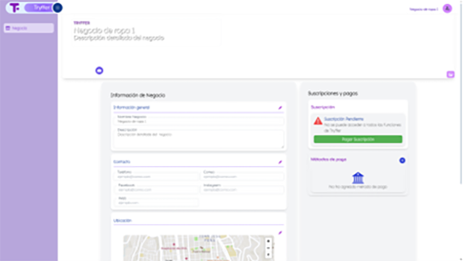 El objetivo de la aplicación web es gestionar la información de los negocios y las ofertas, para ello cada negocio debe registrarse para crear una cuenta y realizar el pago del servicio. Al registrar un nuevo negocio, no se podrá acceder a todas las funcionalidades como: información del negocio, suscripciones y pagos por el servicio de la plataforma y métodos de pago, donde se puede agregar la información necesaria para que el administrador pueda realizar las transferencias al negocio.