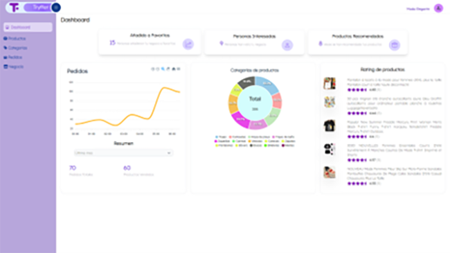 Uno de los módulos principales de la vista del negocio es el panel de control, que presenta información estadística sobre la cantidad de pedidos realizados, la calificación de los productos y gráficos de pastel que muestran los porcentajes de productos divididos por categoría.