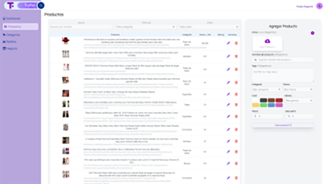 La pantalla de productos permite al negocio gestionar la información de los productos ingresados en la plataforma, incluyendo filtros para navegación y búsqueda, agregación, edición y eliminación productos.