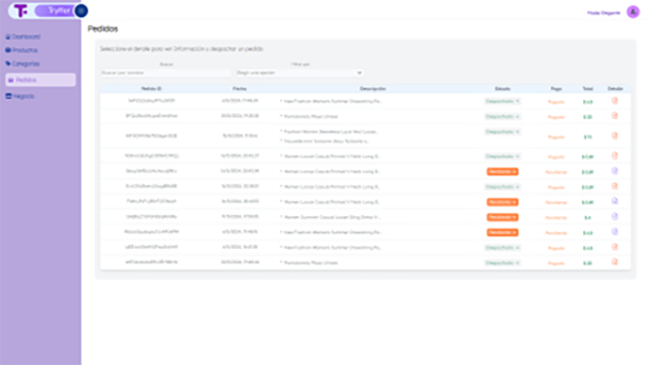 También, la aplicación web incluye la gestión de pedidos, donde se presentan todos los pedidos registrados desde la aplicación móvil. Esta funcionalidad permite filtrar pedidos y despachar aquellos que aún no han sido procesados. Además, se puede visualizar los detalles específicos de cada pedido.
