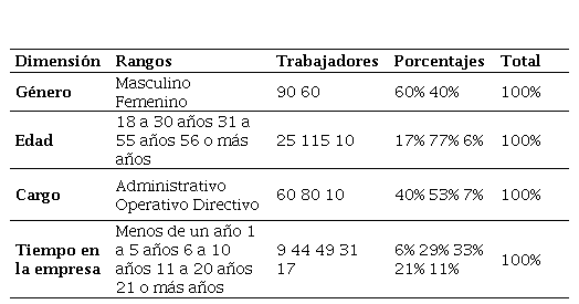 Se trabajó con toda la población constituida por 150 colaboradores de la empresa productiva localizada en la provincia de Tungurahua, cantón Pelileo. De acuerdo con la Tabla 1 se divisa que respecto al género la mayoría de los colaboradores son hombres con un 60% frente a un 40% de mujeres. Asimismo, en cuanto a la edad de los trabajadores se analiza que un 17% se encuentran en el rango de dieciocho a treinta años, un 77% entre treinta y uno a cincuenta y cinco años y un 6% entre cincuenta y seis o más años. Adicionalmente, se indica que el 40% desempeñan un cargo administrativo, el 53% cargo operativo y un 7% cargo directivo. Por otro lado, referente al tiempo que se encuentran en la empresa se visualiza que el 6% se encuentran menos de un año, el 29% de uno a cinco años, el 33% de seis a diez años, el 21% de once a veinte años y un 11% desde veintiuno o más años.