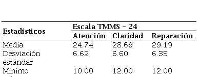 Por otro lado, la claridad emocional alcanza una media de 28.69, lo que sugiere una comprensión sólida de sus propias emociones y la capacidad de expresarlas de manera efectiva (Mayer et al., 2008). Las puntuaciones varían entre los 12 y 40 puntos con una desviación estándar de 6.60.