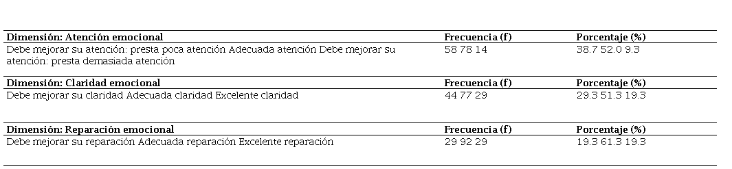 En la dimensión reparación emocional el 19.3% debe mejorar su reparación, lo que sugiere que pueden experimentar dificultades en el manejo y la restauración de sus emociones después de enfrentar escenarios agobiantes o conflictivos en el trabajo (Brackett y Mayer, 2003). Otro 19.3% alcanza el nivel excelente lo que indica que pueden manejar eficientemente sus emociones, superar adversidades y mantener un equilibrio emocional saludable (Ugoani et al., 2015).
