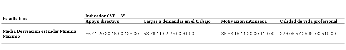 En cuanto a la validación del CVP-35, efectuada en un contexto latinoamericano se desarrolló en una muestra de trabajadores en Chile, donde se ejecutó un Análisis Factorial Exploratorio y se examinó la validez de constructo obteniéndose una consistencia interna muy buena con un alfa de Cronbach de .897. Fenómeno que se reitera en sus indicadores: apoyo directivo alfa de .919; cargas o demandas en el trabajo .770; y motivación intrínseca .854 (Ormeno y Lizana, 2007). Siendo una herramienta confiable y válida como una medida multidimensional de la CVP, apropiada para diversos contextos gracias a su amplitud discriminatoria y su distribución factorial (Monsalve et al., 2020).