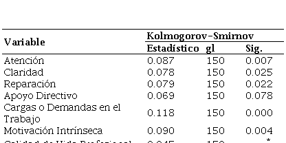 Se encontraron correlaciones positivas y significativas entre la reparación emocional y el apoyo directivo (coef. = 0.381, p < 0.001), la motivación intrínseca (coef. = 0.383, p < 0.001) y la calidad de vida profesional (coef. = 0.345, p < 0.001). Esto sugiere que los empleados que perciben un mayor apoyo directivo tienen una mayor motivación intrínseca y una mejor calidad de vida profesional tienden a tener niveles más altos de habilidades de reparación emocional en el trabajo. No se encontró una correlación significativa entre la reparación emocional y las cargas o demandas en el trabajo (coef. = 0.009, p = 0.910).