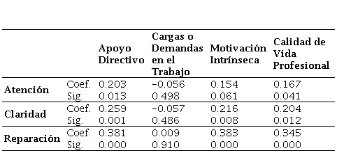 Hay correlaciones positivas y significativas entre la claridad emocional y el apoyo directivo (coef. = 0.259, p = 0.001), la motivación intrínseca (coef. = 0.216, p = 0.008) y la calidad de vida profesional (coef. = 0.204, p = 0.012). Esto indica que una mayor claridad emocional se relaciona con un mayor apoyo directivo, una mayor motivación intrínseca y una mejor calidad de vida profesional, pero no con las cargas o demandas en el trabajo (coef. = -0.057, p = 0.486).