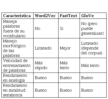 En comparación, FastText superó a GloVe en la capacidad de generalizar palabras OOV, gracias a su habilidad para crear vectores a partir de subpalabras. Aunque Word2Vec no fue tan eficaz en este aspecto, demostró una mayor capacidad de generalización que GloVe cuando se entrenaba adecuadamente. En términos de eficiencia computacional, Word2Vec resultó más rápido que GloVe, que requiere calcular y factorizar una gran matriz de co-ocurrencias. Además, Word2Vec capturó mejor las relaciones semánticas y sintácticas, mientras que FastText destacó en el tratamiento de la morfología y las palabras raras, mostrando mayor flexibilidad en idiomas o dominios especializados.