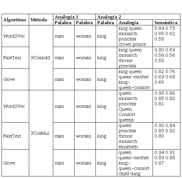 Interpretación: Las fórmulas 3CosAdd y 3CosMul calcularon la similitud entre dos palabras (a y b) como el coseno del ángulo entre sus vectores de representación (v_a, v_b y v_c).