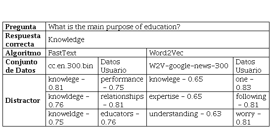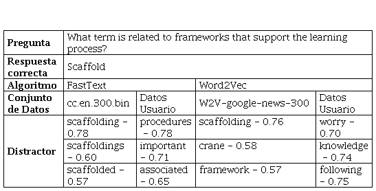 Finalmente, en la Tabla 7, se presentan los resultados para una pregunta sobre marcos que apoyan el proceso de aprendizaje. En Word2Vec, la palabra que más distrajo fue "scaffolding", con una similitud coseno de 0,76. Otros distractores incluyeron "following" (0,75), "important" (0,71) y "knowledge" (0,74). De manera similar, en FastText, "scaffolding" fue el distractor más relevante (0,78), seguido de "procedures" (0,78) y "associated" (0,65).