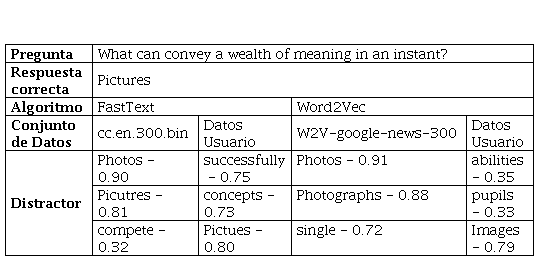 En la Tabla 6, se exponen los resultados de la generación de distractores para la pregunta "What can convey a wealth of meaning in an instant?". Los distractores con las puntuaciones más altas fueron "Photos" (0,90 en FastText y 0,91 en Word2Vec), lo que sugiere que el modelo fue efectivo en la generación de distractores. Sin embargo, también se generó un distractor ("compete") que no está relacionado con la pregunta, lo que evidenció que el modelo puede producir distractores irrelevantes.