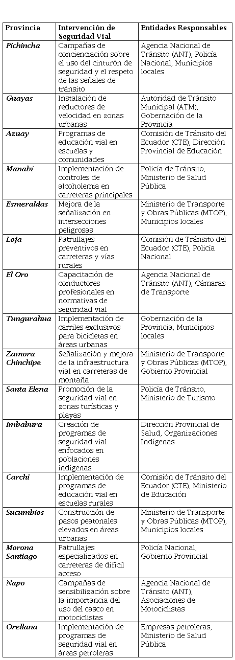 Como se puede observar las siguientes provincias no se mencionan como receptoras de intervenciones de seguridad vial en el mapa: Bolívar, Cañar, Chimborazo, Cotopaxi, Galápagos, Los Ríos, Pastaza, Santo Domingo de los Tsáchilas. La ausencia de intervenciones puede surgir por necesidad de evaluación continua de la efectividad de las intervenciones actuales y por la expansión de programas a las provincias faltantes, la participación activa de las comunidades locales y las mismas pueden proporcionar información valiosa sobre las áreas problemáticas y colaborar en la implementación de soluciones prácticas, políticas integrales que abarquen a todas las provincias contribuiría a una mejora generalizada en la seguridad vial en todo el país.