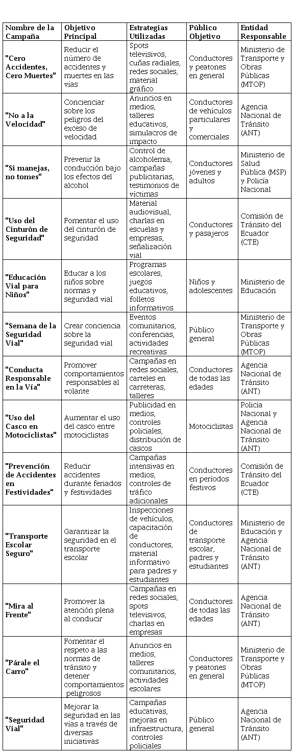 En Ecuador, en todas las provincias del país, se aplicaron varias acciones en seguridad vial a través de campañas de información, tal como se indica en la Tabla 3.