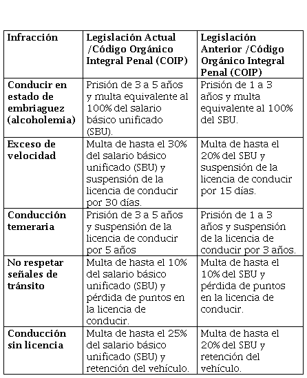 A continuación, se presentará un cuadro comparativo (Tabla 4) entre las penas y multas por infracciones de tránsito según el Código Orgánico Integral Penal (COIP) y las penas y multas de la legislación anterior.
