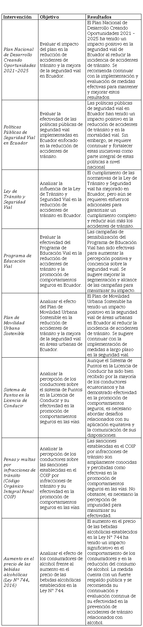 El análisis de las intervenciones de seguridad vial en Ecuador revela la complejidad del problema y la necesidad de abordarlo desde múltiples frentes. A lo largo de este estudio, se han examinado diferentes aspectos relacionados con El Plan Nacional de Desarrollo Creando Oportunidades 2021-2025, Infraestructura Vial Mejorada, Educación y Concientización Vial, Fiscalización y Cumplimiento de Leyes de Tránsito, Promoción de la Movilidad Sostenible, Métodos considerados fallidos en su implementación que influyen en la seguridad en las carreteras del país.