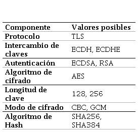 La Tabla 1 muestra los componentes combinables de los conjuntos de suites de cifrados considerados por IANA (Internet Assigned Numbers Authority) (Rescorla, 2008), exclusivos para el protocolo TLS en su versión 1.2.