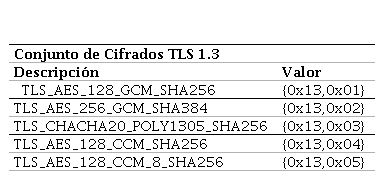 La Tabla 2 muestra los conjuntos de suites de cifrados exclusivo para el protocolo TLS en su versión 1.3, considerados por IANA en el RFC8446 apéndice B.4 (Rescorla, 2018).