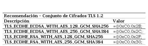 Con base a estas recomendaciones, IETF exhorta a aplicar el uso de los siguientes conjuntos de cifrados del protocolo TLS 1.2 en los servidores como primera opción, (Tabla 3).