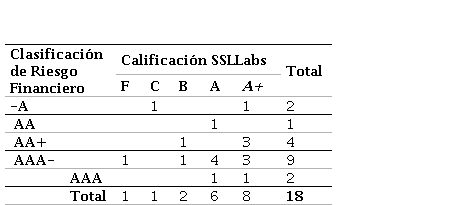 El 80 % de las bancas virtuales en línea analizadas propiciaron una buena aplicación del uso del certificado de seguridad. Existieron dos entidades bancarias con la mejor calificación de riesgo financiero “AAA”, una de ellas obtuvo calificación “A+” en el test de SSLLabs, como se manifestó anteriormente. Eso significa que posee una buena parametrización en la aplicación del conjunto de cifrados del protocolo TLS del lado del servidor y el restante se adjudicó “A”. Tres entidades crediticias pertenecientes al grupo de riesgo financiero “AAA-” obtuvieron la mejor calificación SSLLabs “A+”, determinando seguridad en su proceso de comunicación cliente/servidor a través de la capa de transporte.