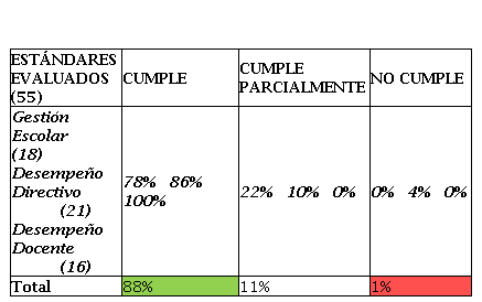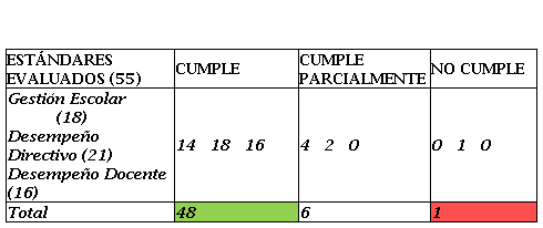 La Tabla 1, presenta el resultado de la evaluación de los 55 estándares de calidad, estándares en los que, la Dimensión de Gestión Escolar (GE) 14 estándares se cumplen de manera satisfactoria, 4 de ellos se cumplen parcialmente. Por otra parte, en Desempeño Directivo (DI) 18 de los 21 estándares evaluados se cumplen satisfactoriamente; 2 se cumplen parcialmente y 1 no se ha implementado. En la Dimensión de Desempeño Docente (DO) los 16 estándares evaluados cumplen o se han implementado.