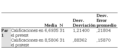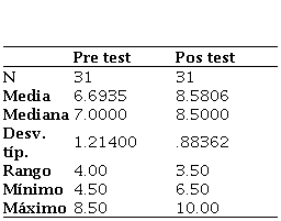 En la Tabla 3 se evidencian el pre-test que parte desde el valor mínimo de 4.5 y su valor máximo de 8.5; cuyas calificaciones dan una media de (6.69), situando los estudiantes en la escala de está próximo a alcanzar los aprendizajes requeridos. Por su parte, en el post-test se tuvo un valor mínimo de 6.5 y un valor máximo de 10, la media fue de 8.85, ubicándolos en la escala de alcanza los aprendizajes requeridos.
