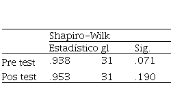 Los resultados obtenidos (Tabla 4) por medio de la aplicación de la prueba de Shapiro-Wilk (puesto que la muestra fue inferior a 50) y dado que el valor de P o significancia fue 0,071 para el pre test y 0.190 para el post-test (mayor que α = 0,05) se concluyó que los datos estuvieron normalmente distribuidos y, en consecuencia, para la prueba de hipótesis se pudo utilizar el estadígrafo T de student.