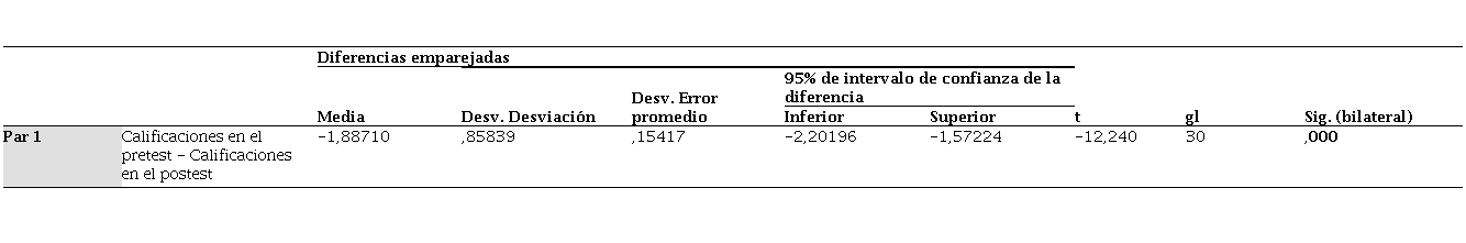 Para dar cumplimiento al objetivo enfocado en determinar la utilización de estrategias de gamificación, se analizaron los datos de forma estadística por medio de la prueba estadística T Student para muestras relacionadas (pareadas). Esta prueba permitió establecer la diferencia significativa entre un pretest y post-test, ya que comparó los datos cuantitativos que arrojaron. Para su desarrollo se tomaron en cuenta los resultados antes y después de la intervención.
