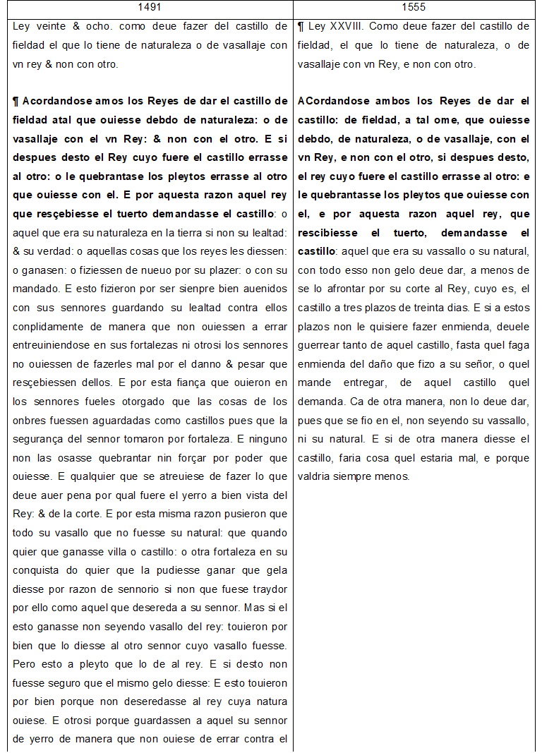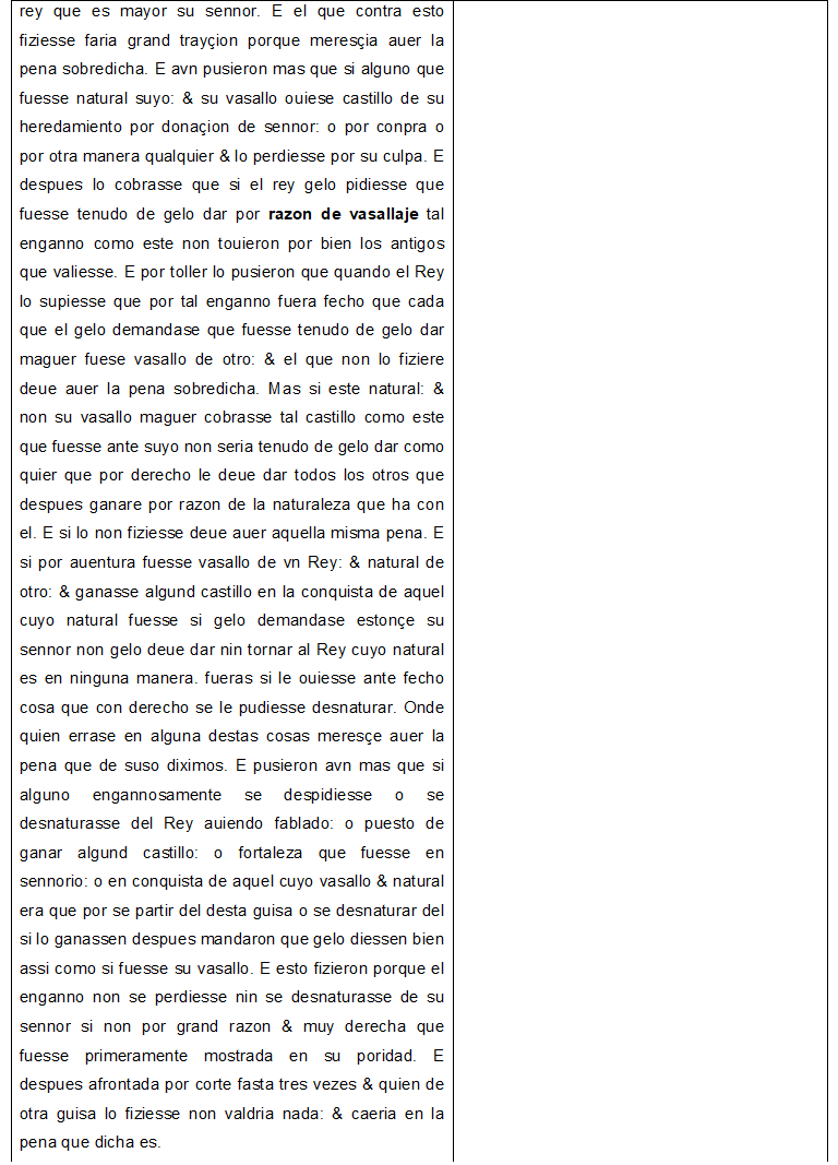 Dado que en las labores iniciales de 7PartidasDigital tomamos la edición de Sánchez-Arcilla (2004, pp. 273-274) como guía rápida de acceso al texto completo de las Siete Partidas, pudimos constatar la veracidad de la afirmación del escriba de TN4, pero, asimismo, comprobamos que no solo había similitud de palabras entre 2.18.32 y 2.18.28 desde “avn pusieron mas” y “por rrazon del vasallaje”, como se indica en la nota, sino que la mayor parte de 2.18.28 es idéntica (salvo algunos cambios menores) a 2.18.32. Compulsamos el texto con la edición de López (1555) y la sorpresa es que 2.18.28 es una ley muy breve y que nada tiene del texto que el escribano de TN4 dice que comparte con 2.18.32: