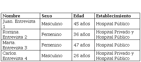 Respecto a la configuración familiar de los enfermeros y las enfermeras tanto Juan, Romina y Marta son padres y madres con hijos e hijas. Por otro lado, Carlos comentó que convive con su madre y hermana y no tiene hijos. Todos los casos son graduados y graduadas en Enfermería Universitaria.