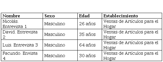 Por otra parte, respecto al sector comercio, se tomó como referentes empíricos a los trabajadores y trabajadoras del Gran San Juan, pertenecientes al sector de venta de artículos para el hogar. Se consideran tanto varones como mujeres, que se encuentren trabajando con una jornada laboral doble turno fragmentado (full time). En función a la edad, no se estableció un criterio, ya que, a los fines de la propuesta, interesa conocer las diversas realidades, en cuanto estructura etaria, configuración familiar y condición social. La entrevista semi-estructurada se aplicó a sujetos de sexo masculino de diferentes edades dentro del rango etáreo. Las entrevistas se realizaron únicamente a varones, lo que se debió no a un criterio de selección previo, sino a que, en el proceso de contactar y coordinar el encuentro, no se pudo coincidir con trabajadoras mujeres.