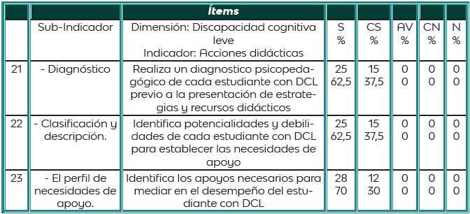 Fuente: Datos obtenidos de los cuestionarios aplicados y procesados estadísticamente.En lo que respecta al indicador acciones didácticas, se obtuvieron los siguientes resultados: en el ítem 21, los docentes en un 62,5% siempre realizan un diagnostico psicopedagógico de cada estudiante con DCL previo a la presentación de estrategias y recursos didácticos, sumado a esto, el 37,5% sumó a la opción casi siempre. En cuanto al ítem 22, los resultados tienen analogía con el ítem anterior (21), puesto que el 62,5% de los docentes siempre identifica potencialidades y debilidades de cada estudiante con DCL para establecer las necesidades de apoyo, donde se acentúa esta posición con un 37,5% en la alternativa casi siempre.