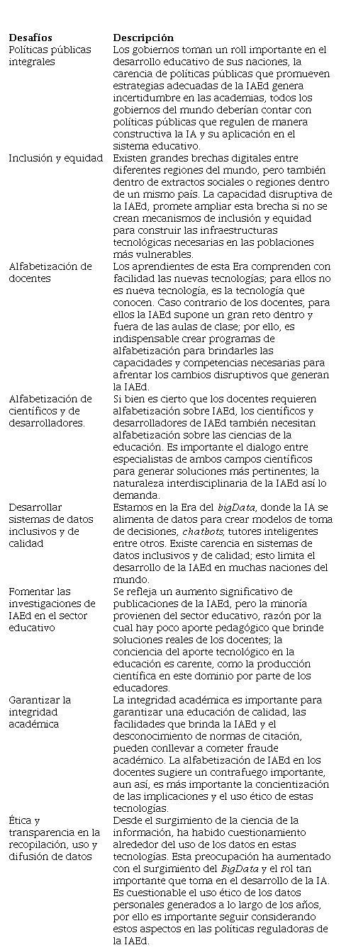 Desde una perspectiva global, la UNESCO (2019) identificó 6 desafíos para lograr el desarrollo sostenible de la IAEd: 1) políticas públicas integrales, 2) inclusión y equidad , 3) alfabetización de docentes, científicos y desarrolladores, 4) desarrollar sistemas de datos inclusivos y de calidad, 5) fomentar las investigaciones de IAEd en el sector educativo, 6) garantizar la ética y transparencia en la recopilación, uso y difusión de datos (Tabla 1).