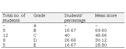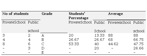 Table 5 presents the vocabulary marks of both private and public school students, with no student achieving a score of 80 or above. The majority of the students fell under grade C and D, with 12 and 8 students respectively, while only 5 students achieved grade B and E. The use of vocabulary of the students from public schools was found to be poor, with limited range and incorrect use of vocabulary. They had minimal use of conjunctions, phrasal verbs, and parts of speech. On the other hand, the private school students were more familiar with everyday English words and demonstrated better word use due to their exposure.