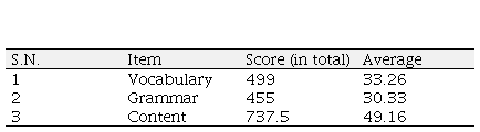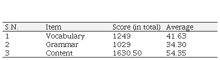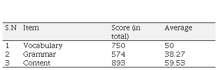 On the other hand, the respondents from private schools were found to be more competent in producing meaningful sentences on given situations, indicating their strong knowledge of content. Among the 15 students from private school, 3 were rated excellent with a mean score of 88, 4 were good with an average of 68, and the remaining 8 were rated average with a mean score of 44.52 in content proficiency. Comparatively, 2 of the 15 students from public school were rated excellent with a mean score of 88, 4 were good with an average of 66.75, 6 were average with a score of 47.75 in average, and the remaining 3 were rated below average with a mean score of 26.66.