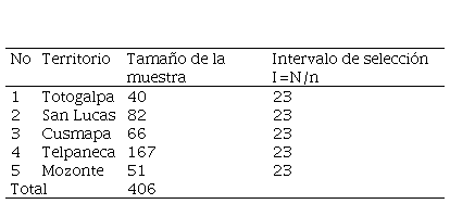 Se realizó un muestreo probabilístico estratificado en un universo de 9,371 familias de cinco territorios del pueblo indígena chorotega, basado en datos del INIDE (2011). La definición de la muestra se calculó según Galindo & Ángeles (1996, págs. 96-102), usando la fórmula de poblaciones finitas y muestreo completamente aleatorio, con un nivel de confianza del 95% y un 5% de error. La muestra fue de 406 familias con un intervalo de selección por estrato de 23, quienes fueron seleccionados y encuestados (Tabla 1).