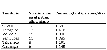 Estas familias están consumiendo un promedio de 1,283 kilocalorías, provenientes de los grupos de alimentos antes mencionados. Comparando con el valor o patrón alimentario indicado por PESA–Nicaragua que establece 1,598 kilocalorías, se experimenta una disminución de 257 kilocalorías. Esto se explica en la no inclusión de productos lácteos y frutas en los productos que consume la mayoría de las familias encuestadas (75% a +). (FAO, 2007).