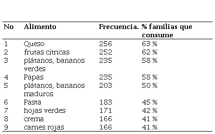 En la tabla 4, se evidencia que son nueve los alimentos pertenecientes a los grupos de lácteos, frutas, verduras, hortalizas y cereales que son consumidos por el 40% al 74% de las familias encuestadas. Los rubros de frutales, musáceas, leche y sus derivados y especies menores su disponibilidad es baja, lo que explica su menor consumo. Las hojas verdes, el queso y la crema se consume en un rango de uno a siete días, con una frecuencia promedio de 5 y 4 días a la semana, el resto de alimentos (6) se consume con menos frecuencia.