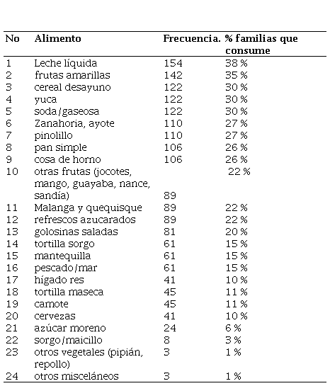 Se encontró que hay 24 alimentos, como se expresa en la tabla 4, que consumen al menos el 40% de las familias encuestadas, siendo los siguientes grupos de alimentos: lácteos, frutas, verduras, cereales y derivados, carnes, azúcar y misceláneos. Es importante destacar que, aunque estos alimentos son consumidos por una menor cantidad de familias, el 67% de estos (24), son consumidos con una frecuencia de uno a siete días (mínimo y máximo) y un promedio de tres a cuatro días, de los cuales, el consumo de alimentos misceláneos: refrescos azucarados y golosinas saladas, soda/gaseosa, son necesarios considerarlos en un proceso de educación nutricional, para disminuir su consumo, ya que proporcionan calorías vacías, provocando un claro desequilibrio nutricional sin ningún beneficio a la salud.