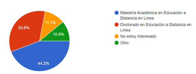 Los docentes expresan estar motivados en continuar estudiando. En este caso, el 44,2% elijen estudiar una maestría académica en Educación a Distancia en línea. Este resultado puede obedecer a que, dado su perfil laboral, el medio más conveniente para estudiar es a través de las plataformas digitales, ya que los horarios se adecúan a su tiempo disponible, lo que responde a la dinámica actual de formación profesional y de su papel como formadores. De igual modo, este resultado permite inferir que los docentes quieren, por un lado, seguir preparándose profesionalmente y, por otro, fortalecer la modalidad virtual a través de la innovación educativa, pues el contexto actual así lo demanda. La otra opción fue estudiar un doctorado en Educación a Distancia en Línea con el 33,8%.