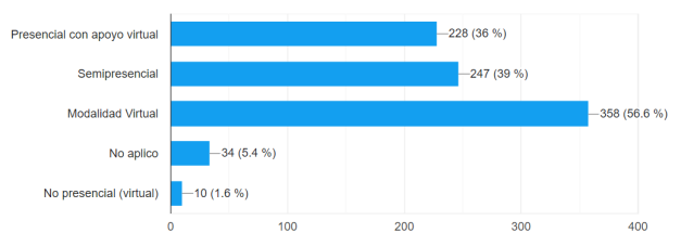 La figura 2 evidencia que la mayoría de los docentes (56,6%) optó por la modalidad virtual, siendo la opción que más se ajusta a sus necesidades, ya que permite a los protagonistas adaptar el estudio a su ritmo, independientemente de sus obligaciones personales y profesionales. De igual modo, los protagonistas también buscan otras modalidades; en el caso particular de la modalidad semipresencial, el 39% la prefiere porque ofrece la oportunidad de vivir la experiencia de un proceso más dinámico y activo.