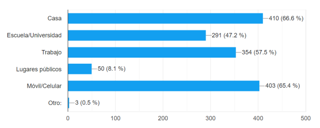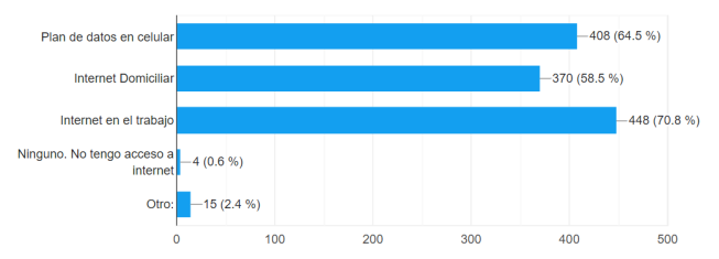 La figura 3 señala que los docentes acceden al servicio de internet desde sus lugares de trabajo (70,8%). Una respuesta así era de esperarse, ya que es el lugar donde se pasa más tiempo, dado que trabajan en instituciones educativas (universidades/escuelas) y usualmente se les proporciona acceso a internet. Le sigue un 64,5% que lo hace a través de un Plan de datos en teléfono celular, con el fin de estar siempre en constante comunicación y resolver problemas a cualquier hora y desde cualquier lugar. Es aquí donde se evidencia la importancia de este recurso, las ventajas que proporciona en cuanto a comunicación y resolución de problemas. El 58,5% señala que utilizan un servicio a domicilio.
