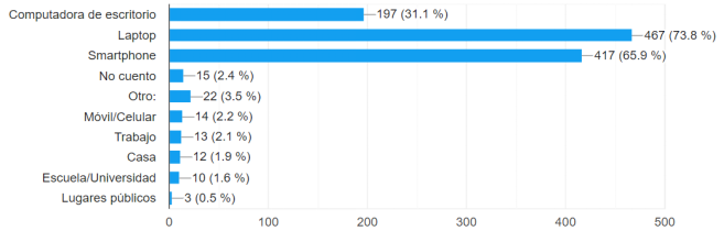 En la figura 5 se aprecia que el 73,8% de los docentes acceden a internet desde su Laptop. Un 65,9% desde su teléfono celular y el 31,1% lo hace desde una computadora de escritorio. Estos resultados indican que en general, los docentes tienen el equipo necesario para acceder a internet y, por ende, dar continuidad a sus estudios de postgrado de forma virtual. Este resultado está muy relacionado con los datos presentados en el estudio realizado por Mendoza y Flores-Pacheco (2021), el cual refleja que, por un lado, los docentes tienen más facilidad para acceder a equipos de computo y, por otro, que ya han desarrollado habilidades en el manejo de estas herramientas, sea que hayan recibido formación durante su profesionalización o de manera autodidacta.