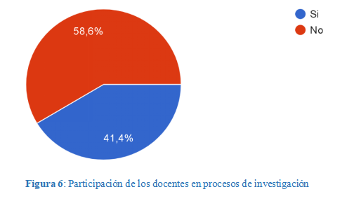 Según los resultados presentados en la figura 6, el 58,6% de los docentes no ha tenido ninguna participación investigativa. Este es un resultado muy alto e impactante, pues refleja una brecha significativa entre el profesional que se tiene y el que debería tenerse. Es necesario, entonces, promover y aumentar la capacidad y participación de los docentes en trabajos de investigación en educación. A pesar de ello, es muy significativo que el 41,4% de los docentes han participado en investigaciones.