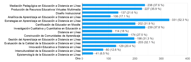 Entre otros temas de interés están: Mediación Pedagógica en Educación a Distancia en Línea (37,6%), Producción de Recursos Educativos Virtuales Multimedia (35,9%), Innovación Educativa a Distancia en Línea (32,1%) y Evaluación de la Calidad de la Educación a Distancia en Línea (31,3%).